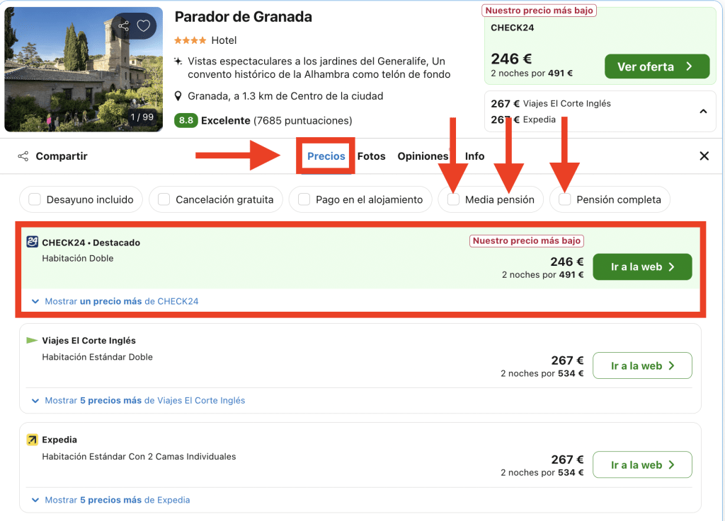 En Trivago, dirígete a la pestaña «Precios» en la página del hotel y elige la opción destacada: