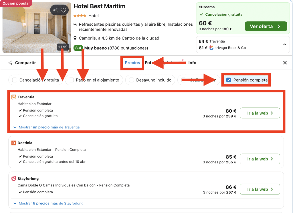 En Trivago, dirígete a la pestaña «Precios» en la página del hotel y elige la opción destacada: