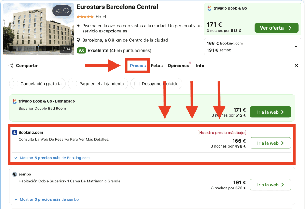 En Trivago, dirígete a la pestaña «Precios» en la página del hotel y elige la opción destacada:
