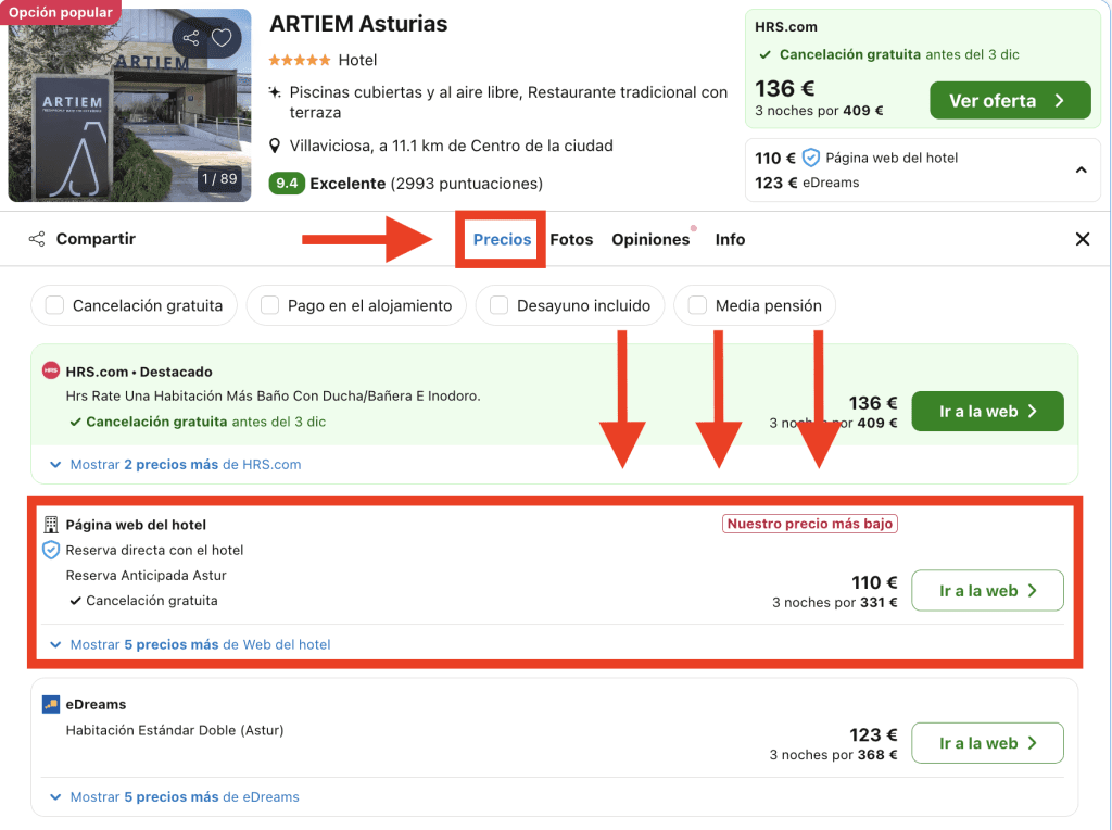 En Trivago, dirígete a la pestaña «Precios» en la página del hotel y elige la opción destacada:
