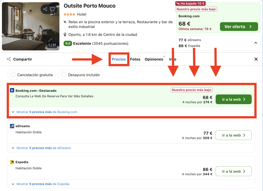 En Trivago, dirígete a la pestaña «Precios» en la página del hotel y elige la opción destacada: