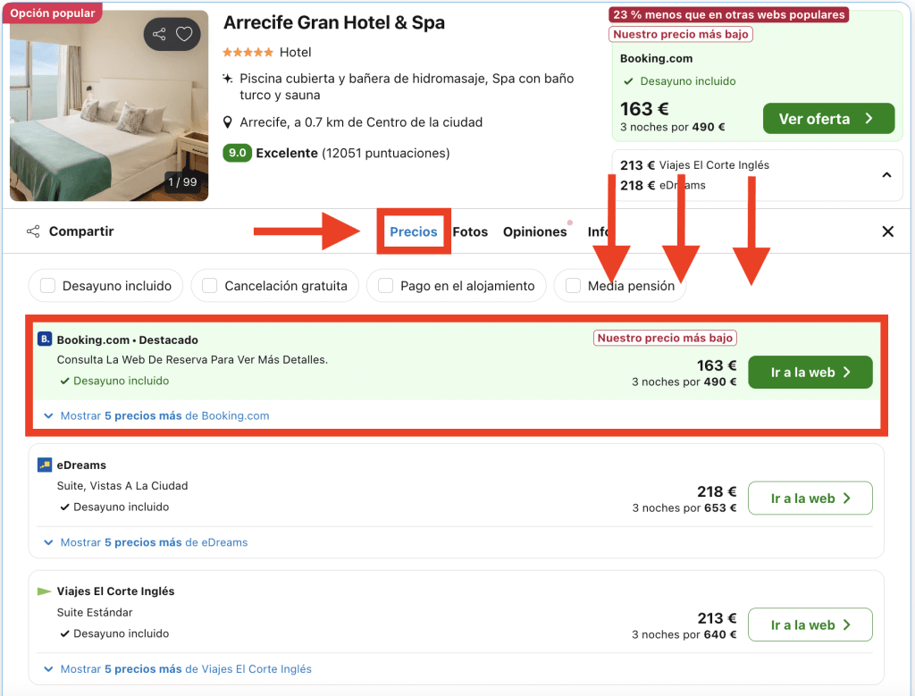 En Trivago, dirígete a la pestaña «Precios» en la página del hotel y elige la opción destacada: