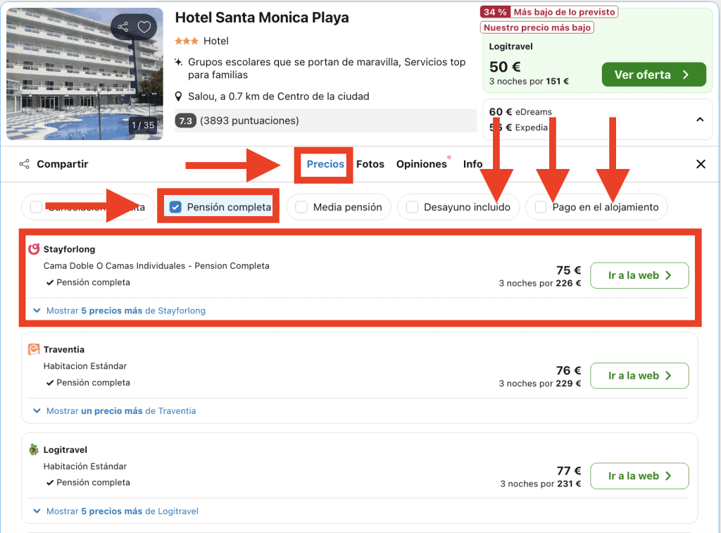 En Trivago, dirígete a la pestaña «Precios» en la página del hotel y elige la opción destacada: