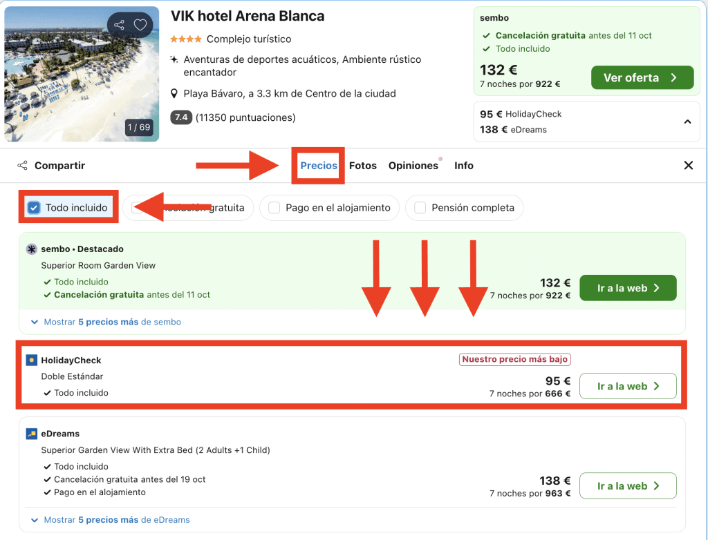 En Trivago, dirígete a la pestaña «Precios» en la página del hotel y elige la opción destacada: