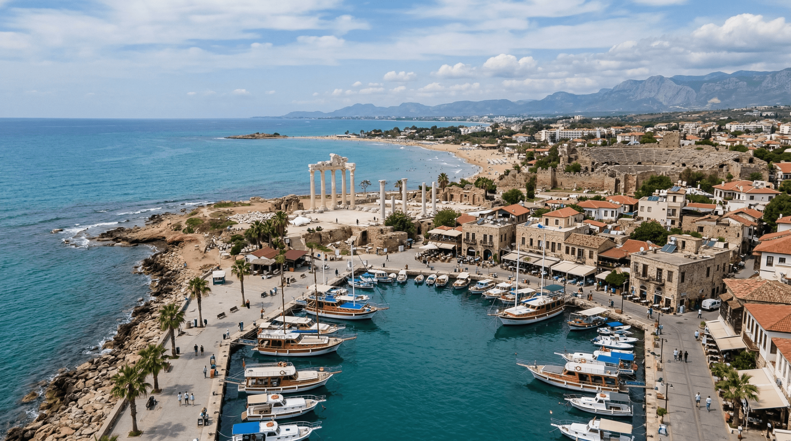 Side es un destino cómodo si buscas mar, historia y días que se hacen fáciles. Hay tramos de playa largos, zonas con sombra para descansar y un aire mediterráneo que se nota en los paseos junto al agua.
