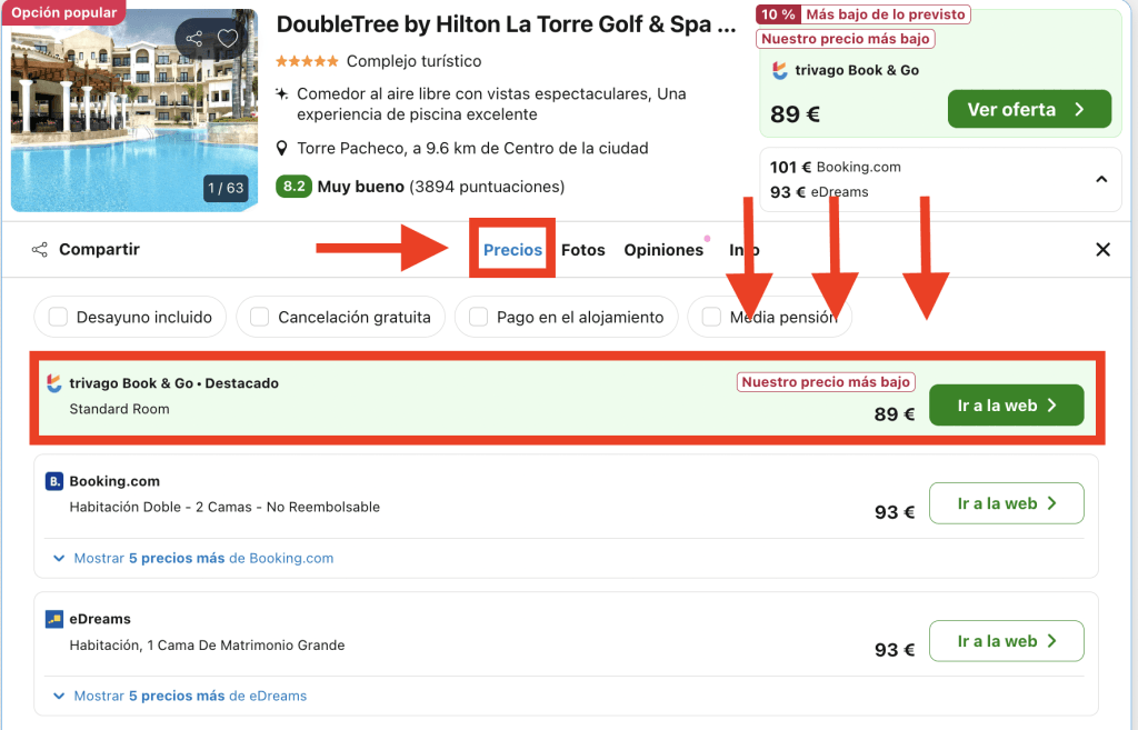 En Trivago, dirígete a la pestaña «Precios» en la página del hotel y elige la opción destacada: