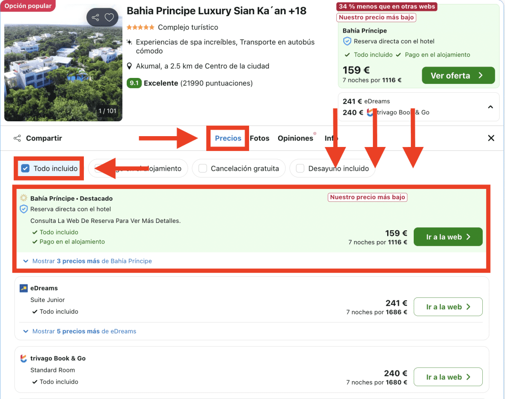 En Trivago, dirígete a la pestaña «Precios» en la página del hotel y elige la opción destacada: