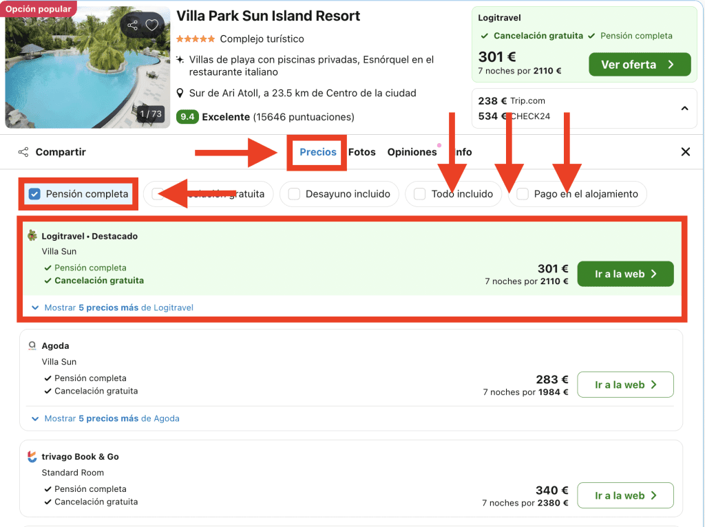 En Trivago, dirígete a la pestaña «Precios» en la página del hotel y elige la opción destacada: