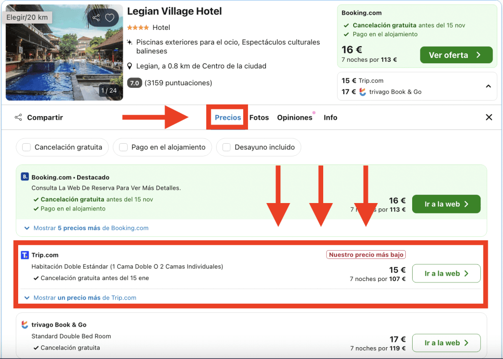 En Trivago, dirígete a la pestaña «Precios» en la página del hotel y elige la opción destacada: