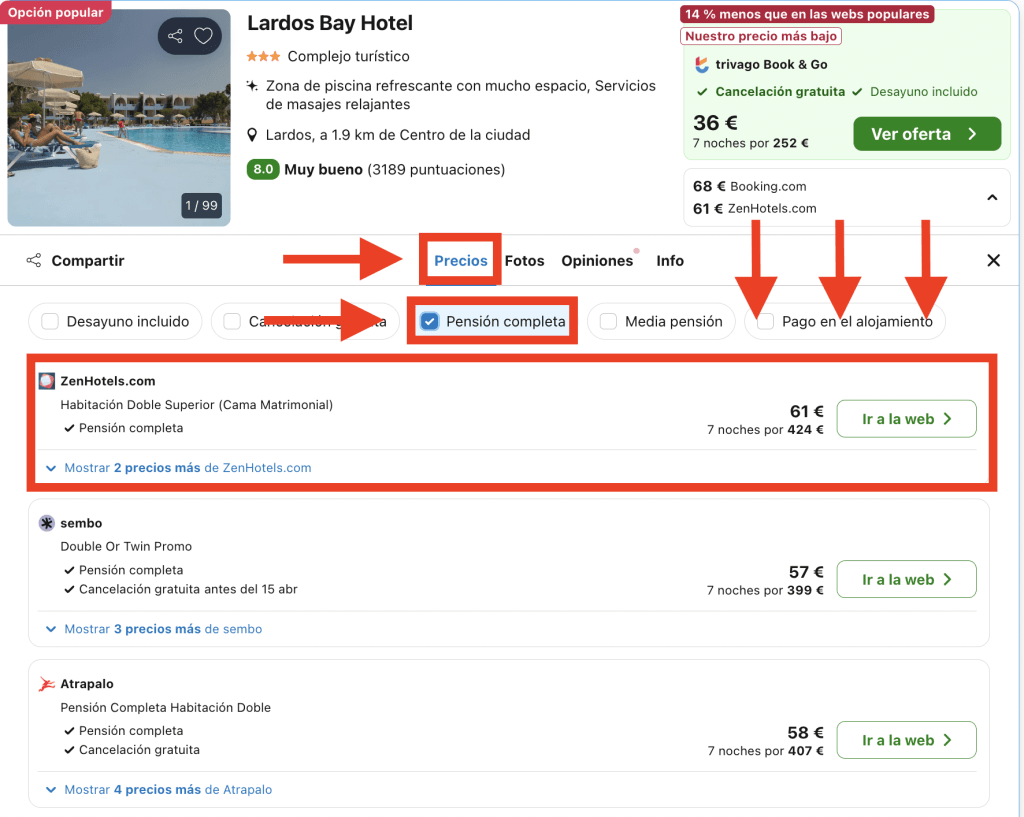 En Trivago, dirígete a la pestaña «Precios» en la página del hotel y elige la opción destacada: