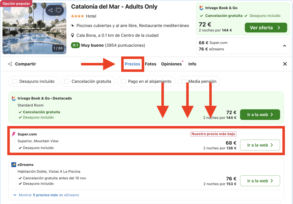 En Trivago, dirígete a la pestaña «Precios» en la página del hotel y elige la opción destacada:
