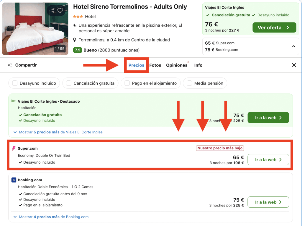 En Trivago, dirígete a la pestaña «Precios» en la página del hotel y elige la opción destacada: