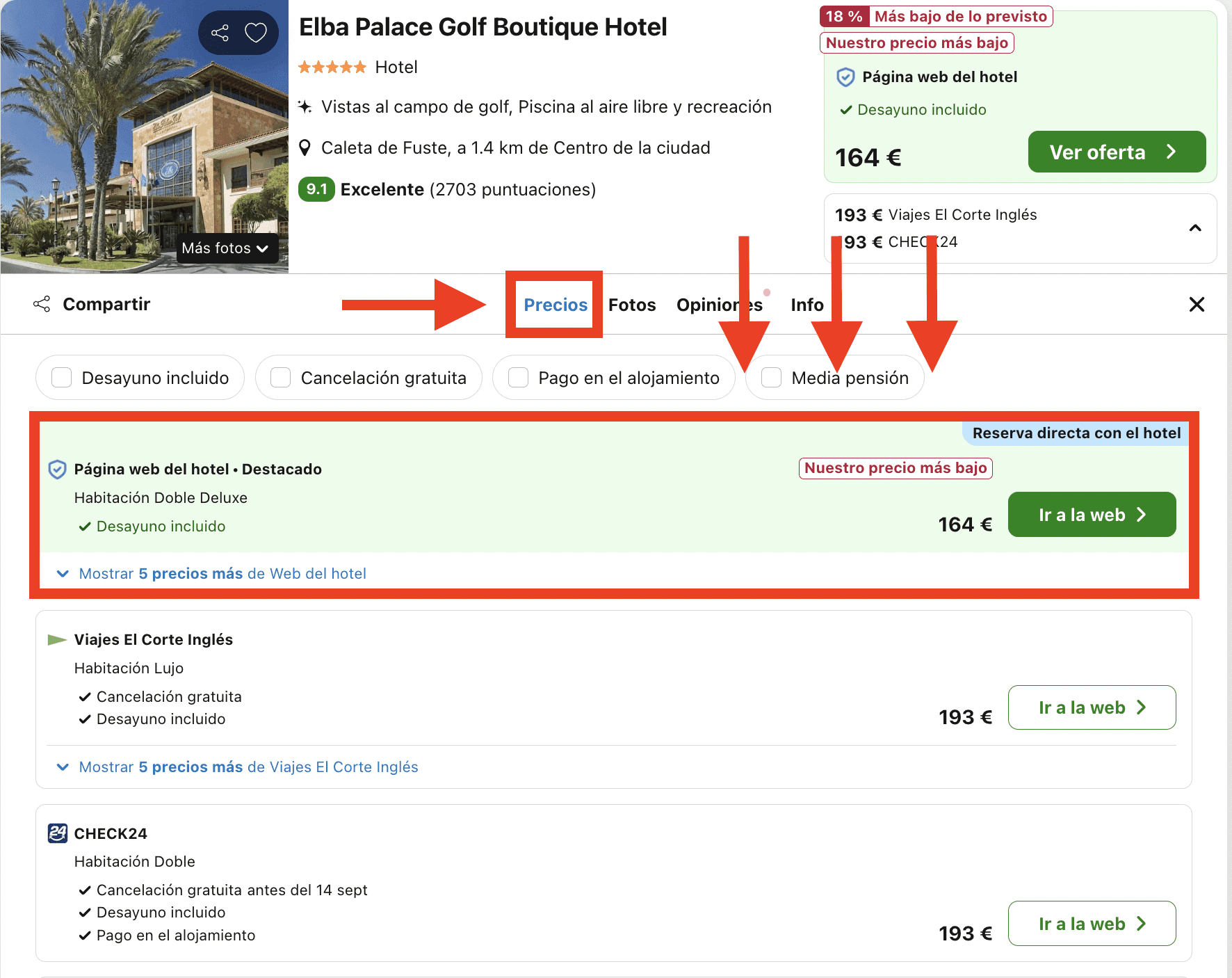 En Trivago, dirígete a la pestaña «Precios» en la página del hotel y elige la opción destacada: