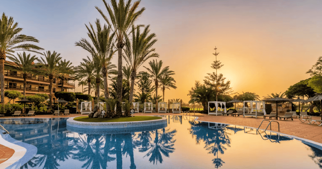 Solo imaginar despertarte frente al campo de golf, asomarte a la ventana y contemplar ese verde infinito… y después bajar a un desayuno variado y un buen café antes de decidir si te zambulles en la piscina, te relajas en una terraza o vas a la playa, que está a solo 800 m (para que te sitúes). Lo mejor es que el hotel lo ofrece sin ser ajeno: se siente cuidado, accesible, en un ambiente en el que quieres quedarte un día más.