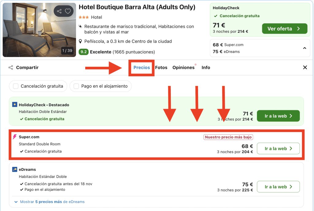 En Trivago, dirígete a la pestaña «Precios» en la página del hotel y elige la opción destacada: