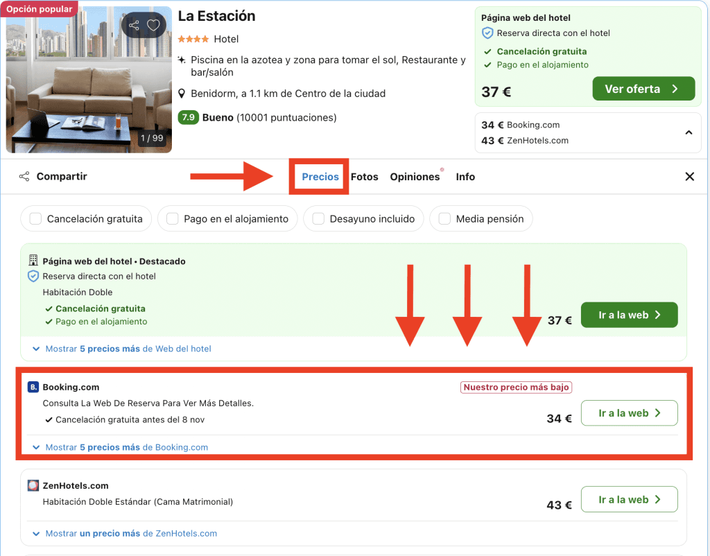 En Trivago, dirígete a la pestaña «Precios» en la página del hotel y elige la opción destacada:
