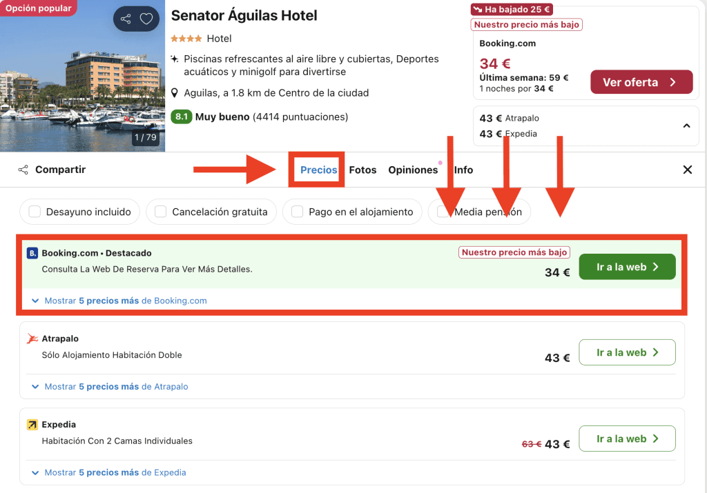En Trivago, dirígete a la pestaña «Precios» en la página del hotel y elige la opción destacada: