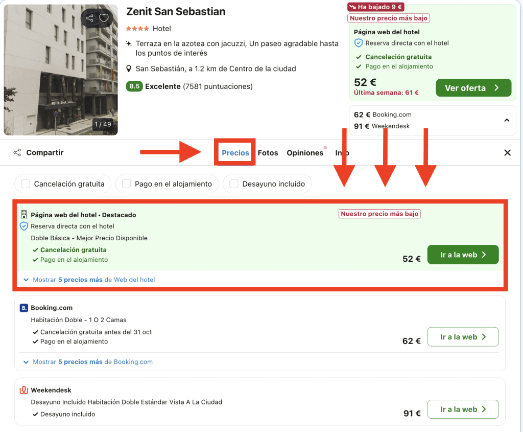 En Trivago, dirígete a la pestaña «Precios» en la página del hotel y elige la opción destacada: