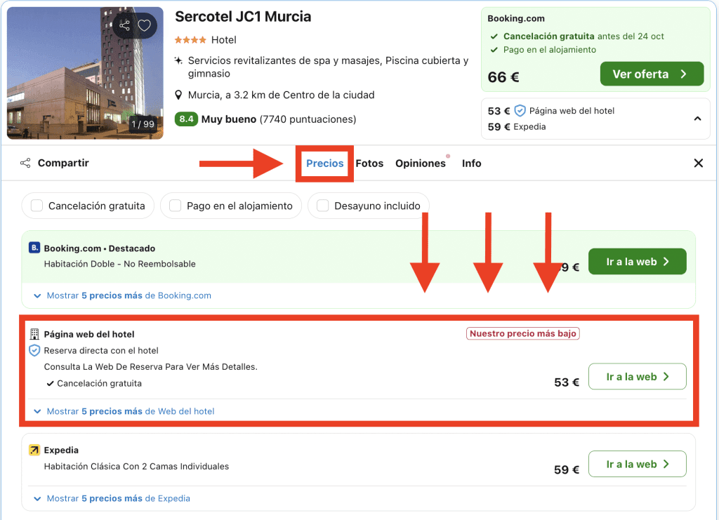 En Trivago, dirígete a la pestaña «Precios» en la página del hotel y elige la opción destacada: