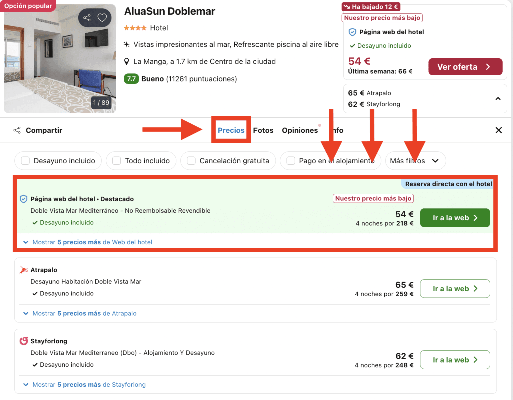 En Trivago, dirígete a la pestaña «Precios» en la página del hotel y elige la opción destacada:
