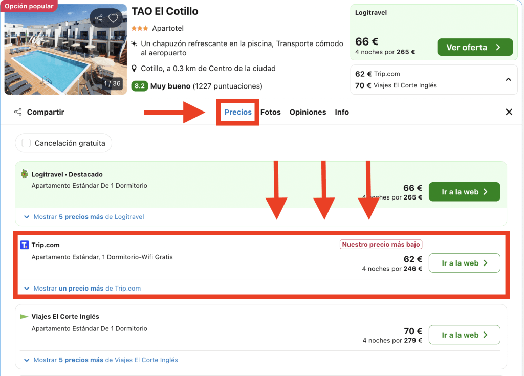 En Trivago, dirígete a la pestaña «Precios» en la página del hotel y elige la opción destacada: