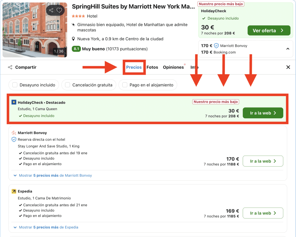 En Trivago, dirígete a la pestaña «Precios» en la página del hotel y elige la opción destacada: