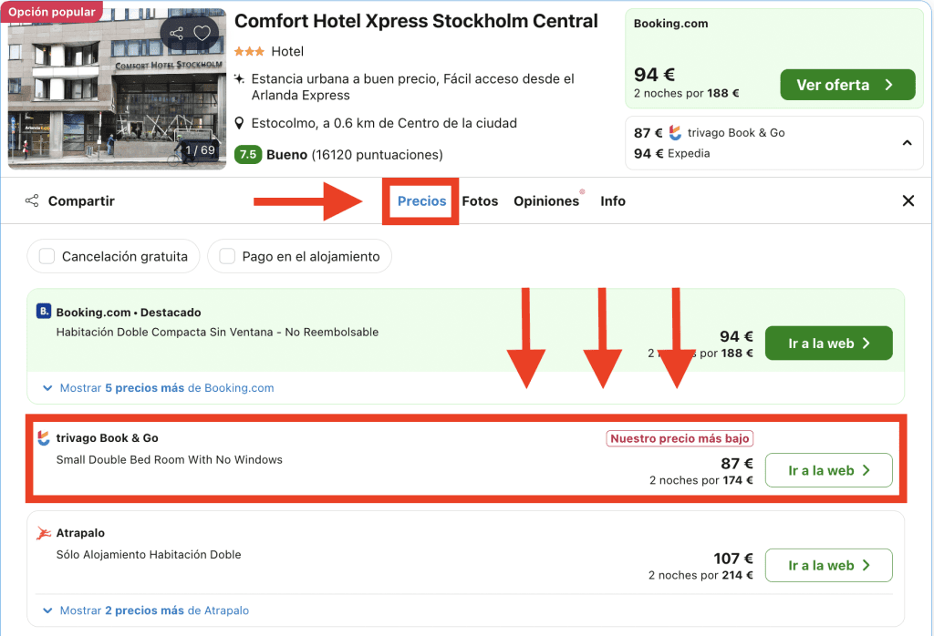 En Trivago, dirígete a la pestaña «Precios» en la página del hotel y elige la opción destacada: