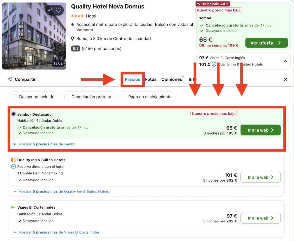 En Trivago, dirígete a la pestaña «Precios» en la página del hotel y elige la opción destacada:
