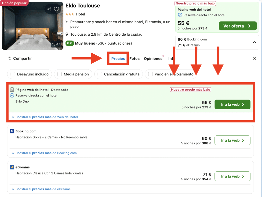 En Trivago, dirígete a la pestaña «Precios» en la página del hotel y elige la opción destacada: