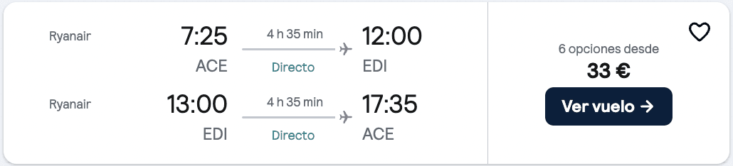 Vuelos a Edimburgo (Reino Unido) desde Lanzarote por solo 16,50€ el trayecto (33€ ida y vuelta).